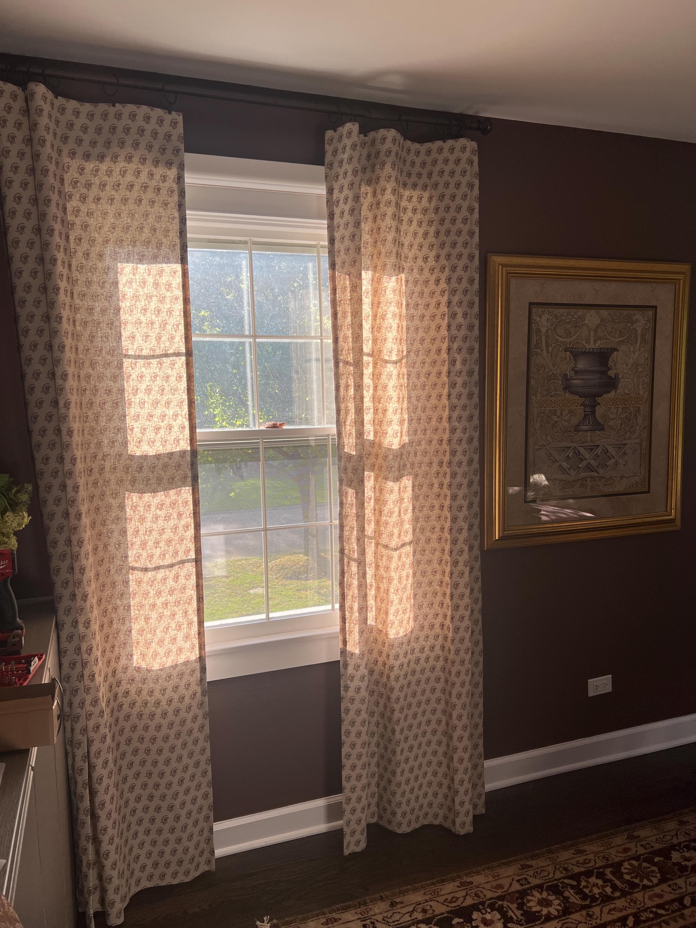 The picture taken in front of the window is curtains with blackout linings. Curtain color is darker shade beige than photo.